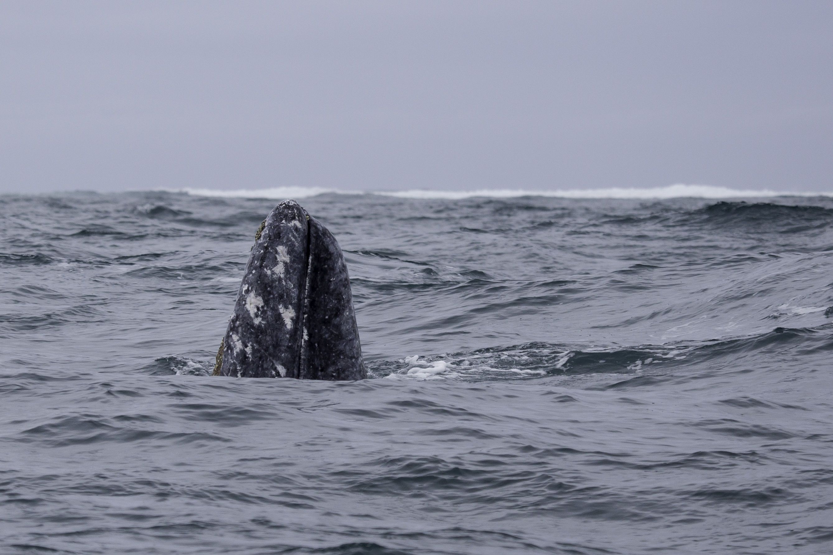We were only a few minutes into our adventure when we spotted whale blows, and once we saw the heart-shaped blowholes, we knew the animals were gray whales! Gray whales have one of the longest (if not the longest) migrations of any mammal—around 10,000 miles round trip. They spend summers feeding in the Arctic to build fat reserves to for their winter breeding season. As winter approaches, the whales travel south to Baja California Sur’s shallow lagoons to birth calves and mate. Today was our lucky day because we saw a mother and calf pair! Though the calves are 15 feet long, they are incredibly tiny compared to their mothers. Gray whales are curious and intelligent animals, and they spent some time investigating our small boats. Outside of seeing the whales surface to breathe, we witnessed unique behaviors such as breaching and spy-hopping.