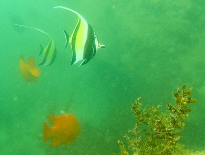 I got to experience a different aspect of this spot, the undersea world. A few of us went for a scuba dive to see what we could find. With the water a chilly 62 degrees and bit murky and agitated, things were not looking good at the start. But once we got down we started to find many treasures of our own. The rocks were covered with algae and many invertebrates, but it was the fish life that caught my eye. Many stingrays were found buried in the sand, showing off their amazing camouflage. The highlight though, was the meeting of temperate and tropical fishes. Many species were the same as my home near Los Angeles, while others were from the coral environment of warmer waters. One special moment was having garibaldis, the state marine fish of California, together with Moorish idols which are found on coral reefs throughout the Pacific.