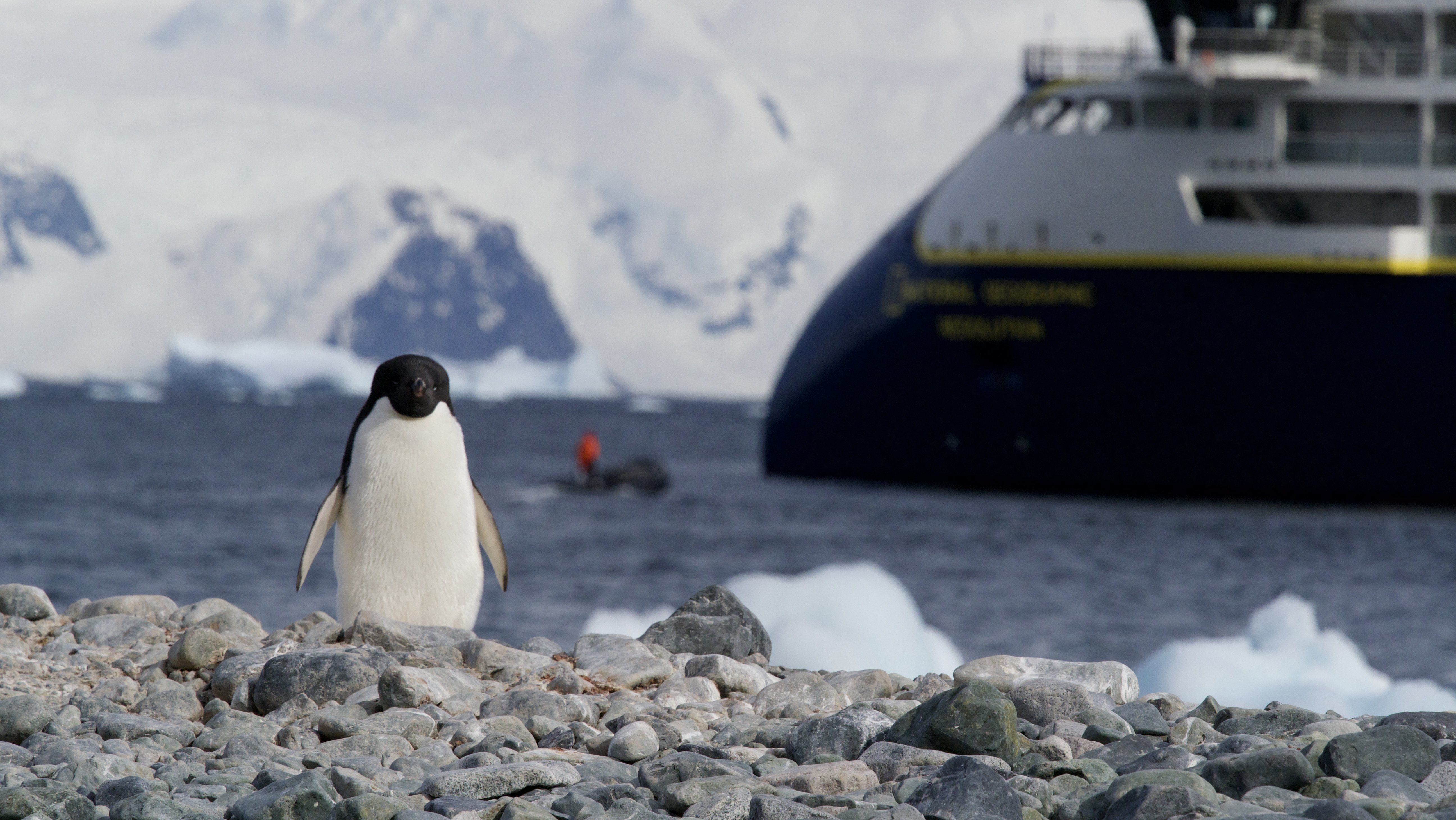 During the night, National Geographic Resolution moved along Adelaide Island. By morning, we reached the quiet waters of Marguerite Bay near the landing site on Pourquoi Pas Island. The sun was shining, and the sky was bright blue. Glaciers and snow atop the steep mountains sparkled.