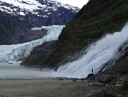 We travelled out to Mendenhall Glacier, passing through a suburban valley that was recently buried in ice. Mendenhall flows from the mountains to end in a large freshwater lake. The visitor center and short trails provide fine views of the ice. Many of us did a brisk walk out to Nugget Falls. Here at the foot of the falls, the view of ice and water are really impressive.