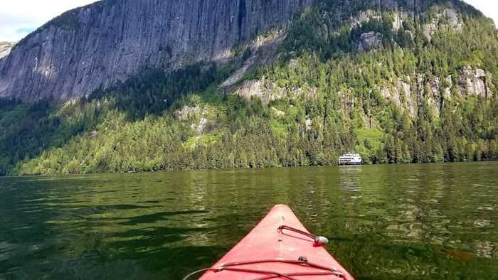 After a pleasant brunch prepared by the talented staff on board, guests readily embarked in another afternoon of exploration, this time to a remote area known for its grand presence. Sculpted by the staggering force of glaciers, Misty Fjords National Monument welcomed those of us aboard with immense rock walls, lush vegetation, and ribbons of waterfalls, which paired perfectly with the continuous and united sense of exploration found among guests. With the sun shining, zodiacs cruised past Sitka spruce, red cedars, and western hemlock trees as kayakers maneuvered about the stellar waters, all in search for more wildlife and natural wonders within the Tongass National Forest.