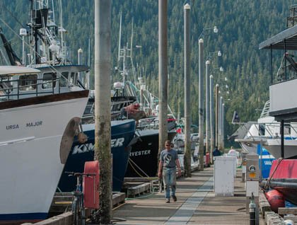 Lunchtime back on the Sea Bird provided time to refresh and prepare for the afternoon in Petersburg. This picturesque fishing town of nearly 3,000 people was founded by Norwegian, Peter Buschmann, who took advantage of the rich fishery nearby and the abundant ice provided by the Laconte Glacier. The town economy is still based on fishing, as is obvious by the fleet of trawlers, crabbers, longliners, and purse seiners docked within the harbor. We split our time between exploring the town independently and following naturalist-led walks. One of the walks was a “dock” walk among the boats and another was across the Wrangell Narrows to Kupreanof Island through a mature forest to a well-developed bog or muskeg. Muskegs are an exotic ecosystem where saturated soil and standing water lead to acidic and nutrient-poor conditions supporting an unusual array of plants. Stunted and bent shore pine seldom rise above six feet and are widely dispersed through a landscape of thick, spongy, sphagnum moss through which small but beautiful flowers protrude. Delicate bog laurel, Labrador tea, bog-rosemary, and bog orchid are seen within the mix. The nutrient-poor nature of the water-soaked soil has led to strange adaptations in which plants like the round-leaf sundew, entrap and consume small insects.