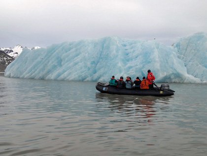 Due to the great weather—blue skies and no wind—we decided to launch kayak operations and Zodiac cruises. It is an impressive experience to paddle a kayak in between icebergs, bergy bits and growlers. We can only imagine the feeling the early travelers must have felt as they got trapped in ice as we easily navigate in our ice-enforced ship and bomber Zodiacs.