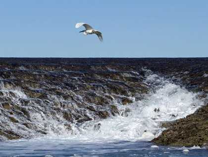 At the mouths of these smaller tributaries, opportunistic wildlife such as turtles, sharks, trevally and batfsh, congregate to feed on the scrumptious morsels that are washed into the channel. As we weaved through turbulent waters, all around us green sea turtles constantly surfaced to catch a breath while eastern reef egrets, both gray and white morphs, stalked prey on the edges of the falls. The morning was truly a photographic delight.