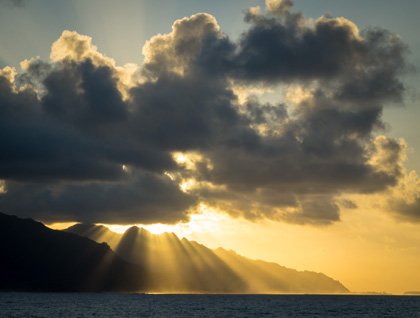 As we departed Moorea, the sun was moving lower in the sky, and spinner dolphins once again paralleled the ship as we departed the island, leaping in the late day sun. The sunset behind the mountains sent golden shafts of light illuminating and penetrating the clouds, reaching down to the sea below.