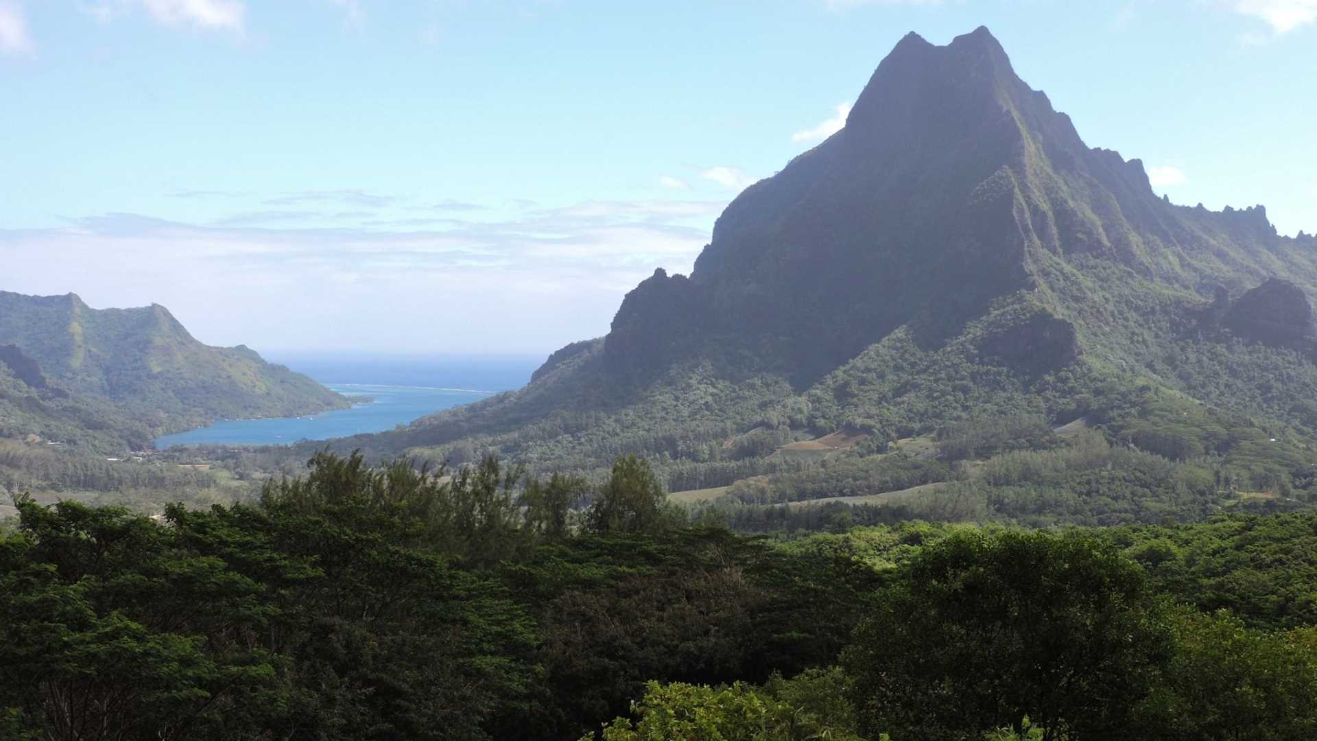 After a night of fairly strong winds and gentle movement among the waves, we entered the very sheltered anchorage site in Cook’s Bay, also known as Opunohu Bay, on the north side of Moorea.  We anchored before breakfast in the center of what was once the volcano’s crater. Here is where we spent the rest of the day as we enjoyed this amazingly lush, verdant, volcanic island. It is the second largest of the Îles du Vent (Windward Islands) in the Society Islands of French Polynesia. Today, les Îles du Vent certainly lived up to their name.  The island is very different compared to the nearby coralline Tuamotu islands, and is reminiscent of the Marquesas Islands. Some people claim Moorea is the most beautiful island in the world, but we have recently spent five days in the Marquesas Archipelago, so some of us might argue that claim. The island is essentially the remnant of an ancient, half-eroded volcano that now presents a rugged and mountainous land, with many streams, fertile soils, and beautiful landscapes.
