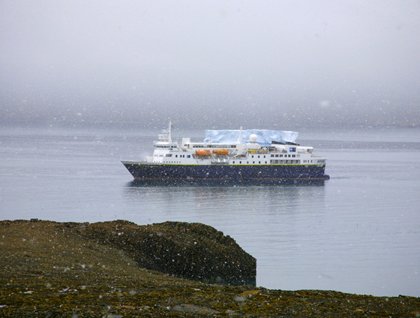 “Bubble netting whales!” came over the loud speaker at 06:20 this morning. What a way to start your day. We trundled up to the bow to find humpback whales plying the waters around our ship as we drifted through thick fog. We could hear the whales surfacing, breathing, and eventually we were able to get quick glimpses of them as the curtain of fog began to lift.