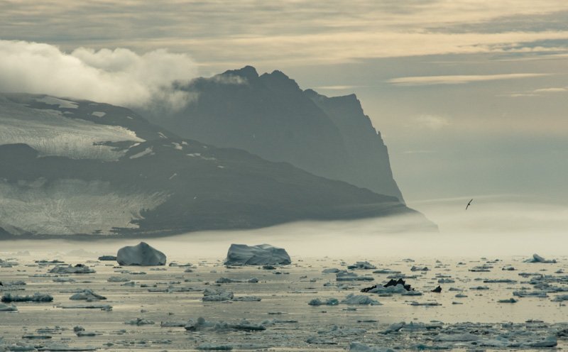 Our southbound journey along the east coast of Greenland took a westward jog this morning as we maneuvered into the ice-choked belly of Nansen fjord. Picking our way as close to the source of this ice as prudence would allow, we took to Zodiacs for a morning ice cruise. Being at water level, surrounded by a glittering sea of gently bobbing crystals, under warm, blue skies rimmed with towering peaks is as close to a spiritual experience as I can imagine. With the occasional discharge of more ice into the fjord, combined with a shifting tide, nothing sat still upon the water. In constant motion the ice heaved and rolled, cracked and groaned as pieces collided and spun around one another. East, west, north, and south–the ice danced and we danced along with it.