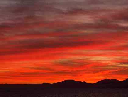 Contributing to the continued joy of everyone aboard the National Geographic Sea Bird, a beautiful red-pink-orange-magenta-and-yellow colored sky welcomed us while navigating south of San Francisco Island (our anchorage last night). Without hesitation our photographers and their cameras worked hard at capturing the uniqueness of this natural palette arranged by nature and produced by the light of the rising sun. The Gulf of California is known, among other things, for the beauty of its scenery and this morning was no exception. The gorgeous light of the sunrise also swept the high and rugged peaks and stratified walls of the La Giganta Range, the magnificent volcanic mountains that characterizes the southern half of the peninsula. They were topped this morning with a dense layer of low clouds and fog. A little breeze brought us a bit of rain and, consequently, a rainbow that looked like a long high-lying wound in the heavens. In the distance, on the quiet, dark ocean we discovered some little blows that indicated the presence of small marine mammals—dolphins, scattered seabirds glided or flew in different directions.