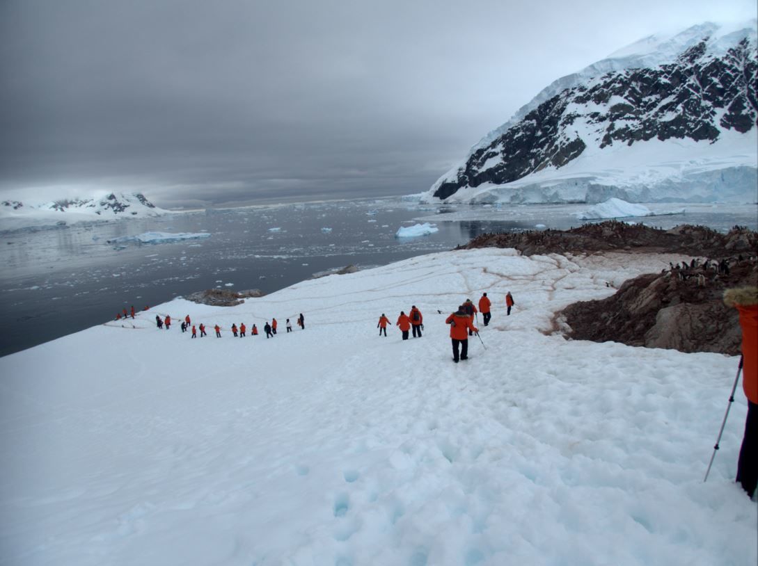 In the morning, our ship entered Ardvoord Bay. A spectacular view greeted us—a repeating pattern of differently coloured cliffs, including cliffs of ice and black rock outcrops. The first activity was a Zodiac cruise. The mirror flat water was choked with pieces of ice of all sizes, from tiny bits to magnificent icebergs that measure up to 70 meters tall. The second activity was landing on the mainland of the Antarctic Peninsula. Guests visited a site known as Neko Harbour, which has multiple rookeries of gentoo penguins along a looping, snowy mountain hike. The highest point of this hike offers a view of the entire bay. Tiny specks of Zodiacs were visible in the distance, many kilometers away, which offered a scale to reference this vast landscape.