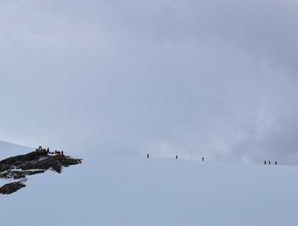 Our first landing of the day was at Neko Harbour, a breathtaking bay named for a whale factory ship which had operated there in the 1900s, but which is now known for its spectacular glacier. Our intrepid Zodiacs picked their way through brash ice to the shore where they were met by a welcoming committee of gentoo penguins from the nearby colony. Situated further south than the colonies we have previously visited, these penguins were still patiently waiting for their eggs to hatch and were guarding them from a pair of circling skuas. With the glacier as their backdrop, our guests took to the snowy slopes surrounding the bay and hiked to a spectacular viewpoint where they could listen for the telltale cracks and creaks that precede a glacier calving. There wasn’t long to wait before the jumbled and precariously-balanced glacier front obliged and a small section of the face gaveway. Ice spilled down into the sea with a crash and the brash ice that coated the surface of the bay was briefly disturbed as waves spread out from base of the glacier. Only guests who were very quick on the draw managed to capture this spectacular moment on camera!