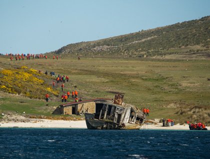 New Island is the most westerly inhabited island in the Falklands archipelago and was for many years a refuge for British and American whalers. After breakfast, in fine, sunny, and characteristically windy conditions we carried out a beach landing by Zodiac with the object of walking across the island to visit a large colony of rockhopper penguins and black-browed albatross. A wreck in the bay was the remains of Glengowan, a ship from Swansea that caught fire on its maiden voyage in 1895 carrying Welsh coal to San Francisco. At the beachhead the island’s Nature Conservation Trust has a small but interesting exhibition on local history, flora, and fauna. The building bears the name of Charles Barnard, a New England sealer who was marooned on the island with four companions for 18 months (1813-14) before being rescued by an English whaling ship. The Barnard Memorial Museum is built on the site of the hut used by the five unfortunates. Sheep on New Island are now confined to a restricted area so that the tussock grass can regenerate. Upland geese, striated caracaras, and skuas were much in evidence.