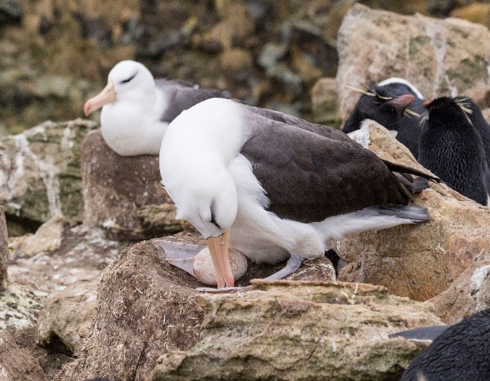 Ding-dong! The early morning bell sounded throughout National Geographic Orion as our expedition leader, Shaun Powell, gently announced that we had reached our first landing site, New Island! A few cups of coffee and early morning pastries helped us perk up for a simply stunning encounter with nesting seabirds while the sun was beginning to rise into the clouds above. Upland geese and goslings welcomed us to soft, sandy beach as our Zodiacs cruised alongside the abandoned wreck of The Protector. Thick pedestals of tussac grass lined our path to a breathtaking scene of blue-eyed shags, rock hopper penguins, and the ever gracefully gliding black-browed albatross. Pairs of penguins nuzzled each other, cleaned their black and white plumage, bellowed charismatic calls, and made quite a stink! Some nesting black-browed albatross even exposed their single, speckled eggs from beneath for a few lucky photographers that were able to snap the shot. It was difficult to leave such an amazing expanse of feathered fauna, yet exploring the eastern islands within the Falkland Archipelago and warm cups of hot cocoa beckoned us back onboard.