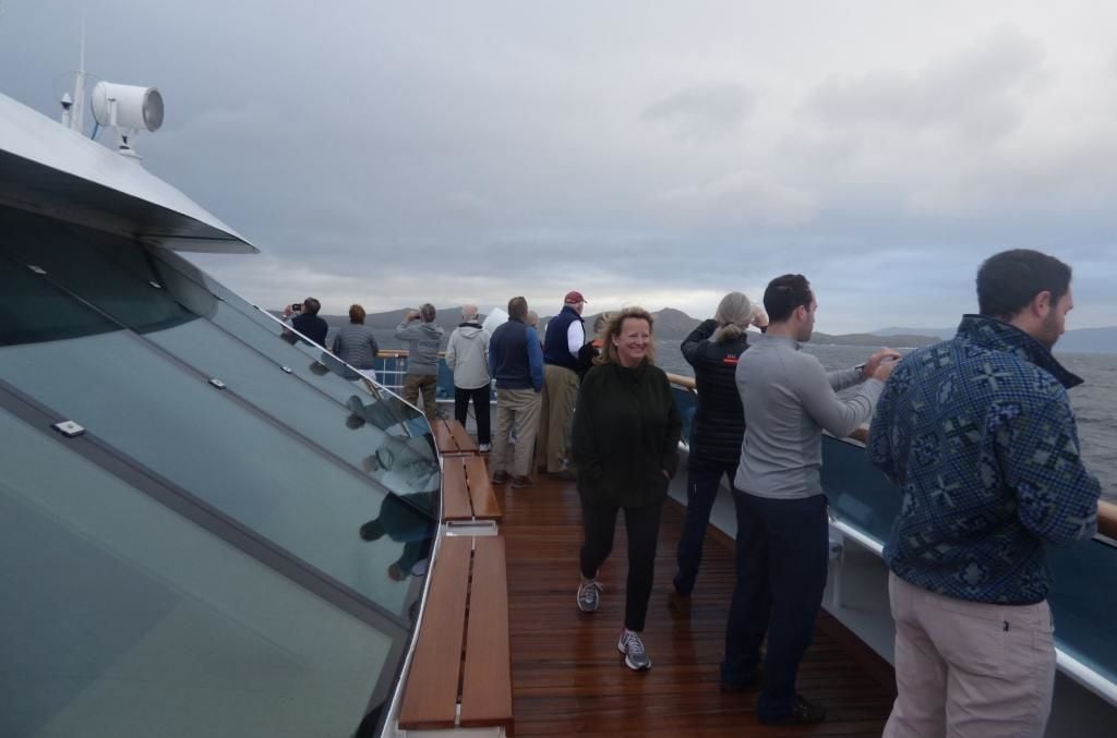 From the time we arose at 6:15 a.m. to watch the sunrise off New Island in the West Falklands until the time the crescent moon appeared at sunset, we were blessed with an exquisite and enriching day. During the morning, we visited a bustling black-browned albatross and rockhopper penguin colony perched over the crashing sea below. In the afternoon, about 50 of us made our way by foot across this rugged yet stunning island to a gentoo penguin colony and sprawling sandy beach.