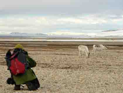 Despite the lack of vegetation, we found a number of reindeer on our hike. It is impressive to see that reindeer are able to survive here under such harsh conditions. The reindeer need to build up a fat storage during the short and hectic summer that will keep them alive during the cold and long winter. When we see how little vegetation there is here on the east side, it makes one wonder how they are able to build up a sufficient fat layer.