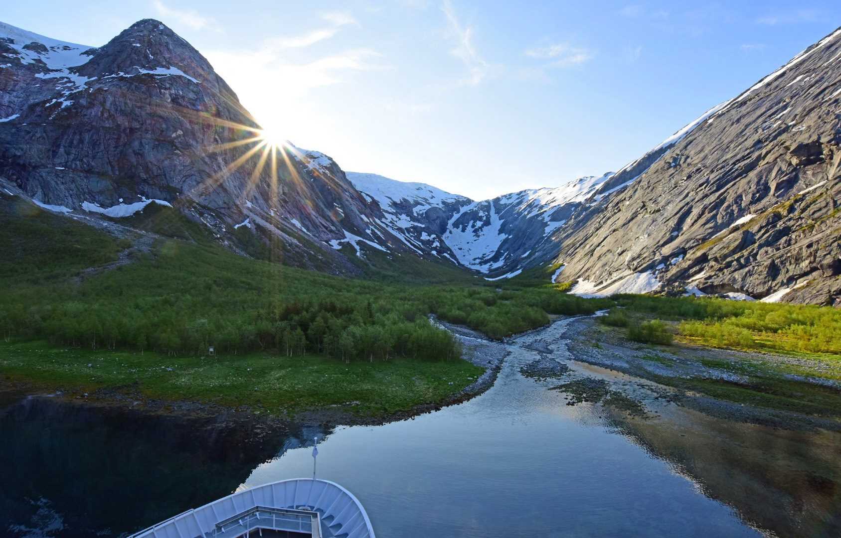 In the early morning National Geographic Explorer smoothly cut the glassy surface of Melfjord, a very scenic fjord in the county of Nordland. We were heading for Svartisen National Park, which extends to the bottom of Nordfjorden, a branch of the Melfjord. Svartisen means "black Ice" and is one of the largest icecaps of the Norwegian mainland. A number of glaciers spill off the icecap, including at the location where the ship had anchored, close to the inner shore of the fjord. This shoreline forms part of the border of the national park. Just as we arrived, the sun peeked over the horizon up above.