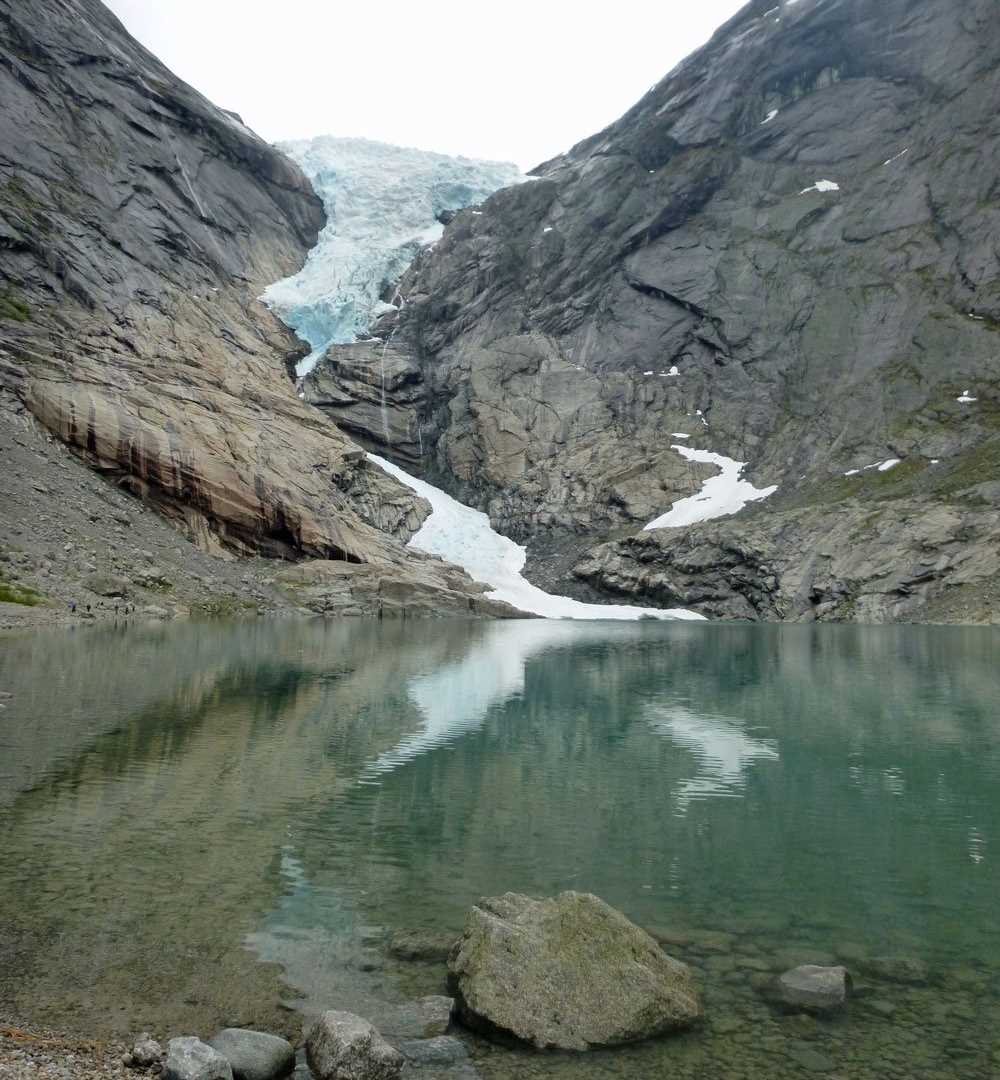 The source of most of this water is high up in the mountains. A lot of this is snow that has melted as spring progresses into summer, but the most significant source is the Briksdal glacier itself. At the end of our trail it hangs over a lake that has formed from meltwater. The lake itself is a recent development, having been cut by the glacier prior to it receding dramatically in the last few decades. This is a very explicit reminder of the increasing rate at which Norway’s climate has gotten warmer in recent years.