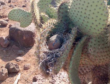 Located in the northernmost area, off of Santa Cruz Island, North Seymour is a small and flat island that was formed after the uplifting of the sea floor, a long time ago. Two weeks ago, it looked dry with palo santo trees completely naked, with no leaves; but today, all of the trees had recovered their greenery due to the last rainfalls which occurred a few days ago. After breakfast, we headed ashore to explore this island, and right from the very beginning we were greeted by Galapagos sea lions and colorful Sally Lightfoot crabs. As we walked into the interior, the lush vegetation contrasted with the dryness observed a few weeks ago. We observed some land iguanas climbing trees or bushes to eat their new green leaves, while others were trying to prevent overheating, resting along the shades under the rocks. One of the best attractions was a Galapagos dove nesting on a cactus tree, whose beauty was overtaken only by its meekness. Walking along the frigatebirds nesting area, we observed many males inflating a their colorful red pouch, that resembles a bright red balloon, and then flapping their wings and making loud sounds to get the attention of females.