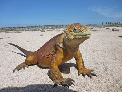North Seymour Island is located in the central realm of the Galapagos Islands, and it is a small island compared to others. This island is one of the best spots to find great and magnificent frigatebirds in their breeding grounds, and it is also the home for Galapagos land iguanas. We disembarked the ship and started the day with a walk along the trail, where we observed small forest of Galapagos incense trees. At this time of the year, these trees are starting to get leaves and flowers, creating a sweet scent that lingers in the air, attracting land iguanas who depend on this good source of food.  Along the path, we found land iguanas, lava lizards, and several male frigatebirds displaying their red inflated gular pouches to attract mates, while the females flew overhead, looking down to select an attractive partner. Both species were observed here, the great and the magnificent.