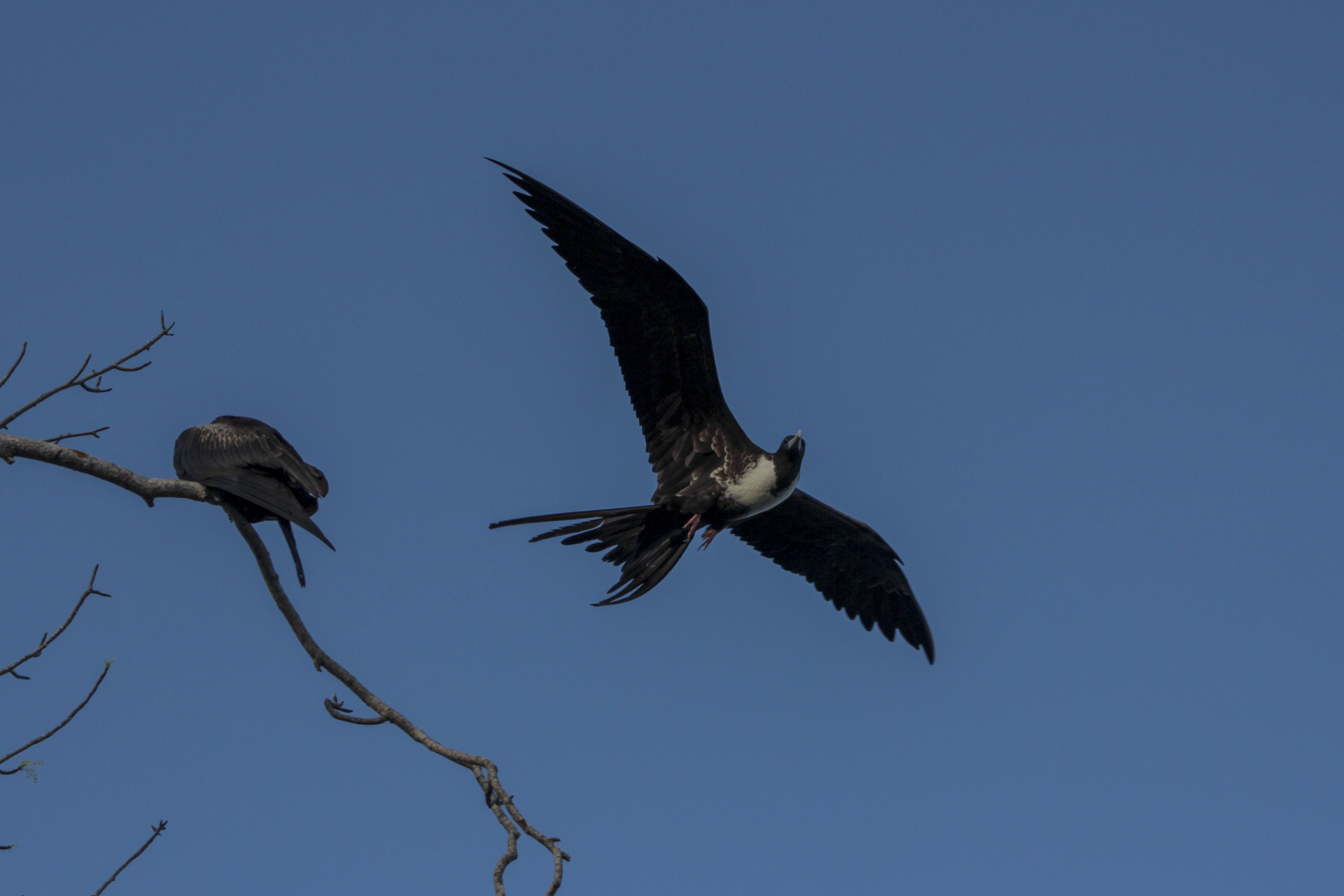 Today we had our first full day expedition. We started by visiting North Seymour, a small island on the central part of the archipelago, located on the northern side from Santa Cruz. The mile and a half hike took our groups through the middle of the island and the nesting colonies of frigatebirds and blue-footed boobies. We also found Galapagos land iguanas, yellow and brown colored, walking and active around the shoreline. Some of these animals were hanging from branches that are already growing the first leaves from the wet season.