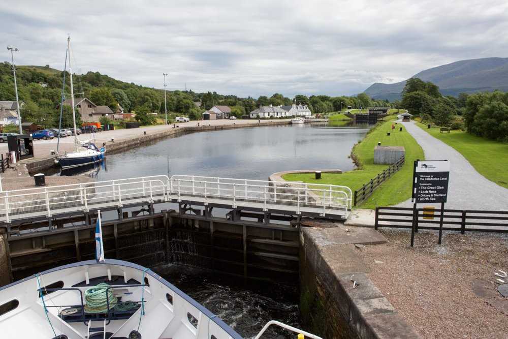 After a pleasant stopover in the town of Oban, we set sail across the sea loch of Loch Linnhe, entering the Caledonian Canal at the Corpach Lock, leaving salt water behind. The rest of our journey will follow the Canal through the Great Glen, headed northeast up to our final destination of Inverness two days from now. Thomas Telford engineered the Caledonian Canal, creating an inland route that avoided the long route around the north coast. The route follows the Great Glen’s natural fault line with its series of lochs, including 22 miles of manmade canal and 38 miles of open lakes, with a total of 29 locks to pass through.
