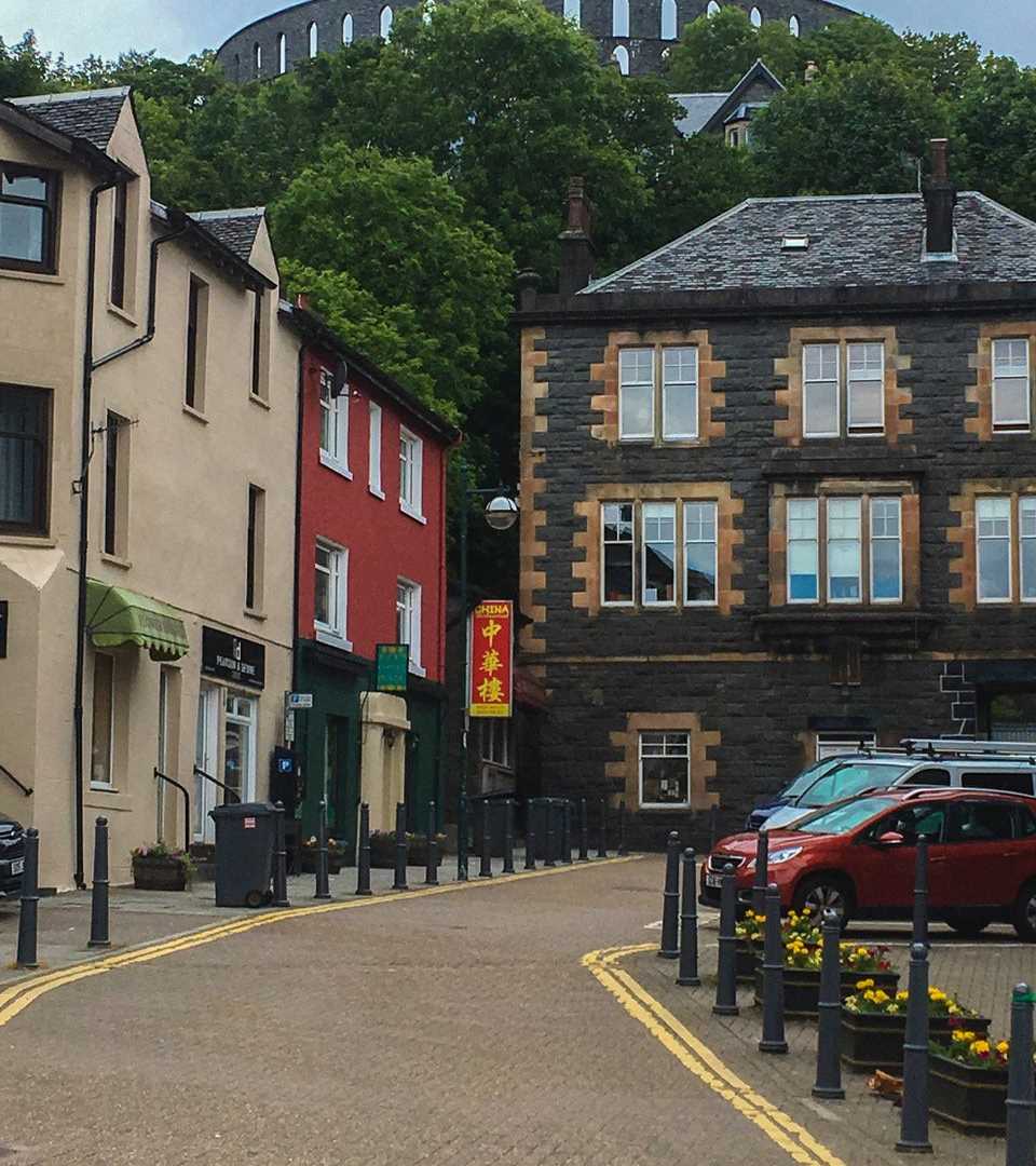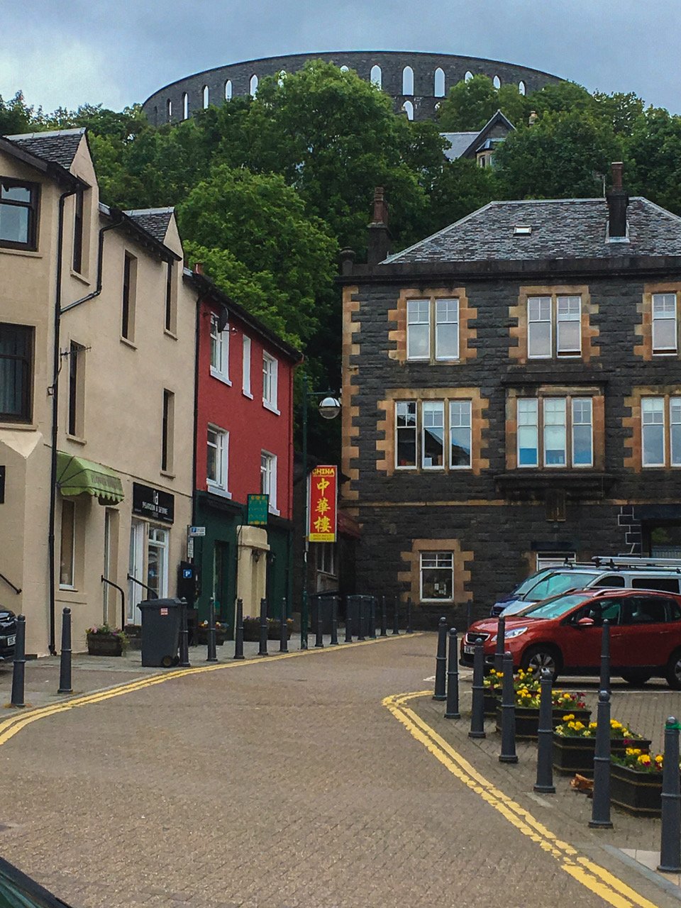 A safe anchorage for yachts, a fishing harbour, a railway terminus (trains to Glasgow) and port of departure by ferry to islands in both the Inner and Outer Hebrides, Oban bustles as a commercial and administrative centre for Argyll, the land of the Gaels. A visit by Queen Victoria and the Prince Consort aboard the royal yacht Victoria and Albert in August 1847 launched modern tourism in the town which today markets itself as Scotland’s seafood capital. The town’s setting is spectacular, sheltered by the island of Kerrera with its conspicuous memorial to David Hutcheson who started ferry services from in the town with his brother-in-law David MacBrayne in 1851 a few years after Queen Victoria’s visit to the town. Guarding the entrance to the harbour is Dunollie Castle, ancestral seat of the MacDougalls. Overlooking the town is McCaig’s Tower, a vainglorious but spectacular folly commemorating the McCaig family and using up a considerable portion of the family fortune; the monument remains incomplete but affords remarkable views over the bay.