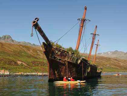 Under bright sunshine we stepped down into the Zodiacs and left the ship, having chosen from a full menu of activities.  A long hike took some of us up the grassy slopes behind the bay and onto a ridge where we could see into the larger inlet of Hound Bay to the south. The kayak platform went out, tucked behind a rocky prominence that sheltered it from the smooth swells rolling into the bay and many of us chose to explore in these small quiet boats, finding our own way along the shores and through the kelp beds.  And a landing at the head of the bay gave us the opportunity to wander through South Georgia’s history, strolling and capturing images among the rusted machinery and disintegrating timbers of the whaling station that was active here in the early 20th Century. From shore and from the kayaks we all enjoyed views of the wreck of the Bayard, a whaling barque that went up on the rocks in 1911 and now provided us with a foreground subject for many beautiful photographs of the bay and surrounding hills.