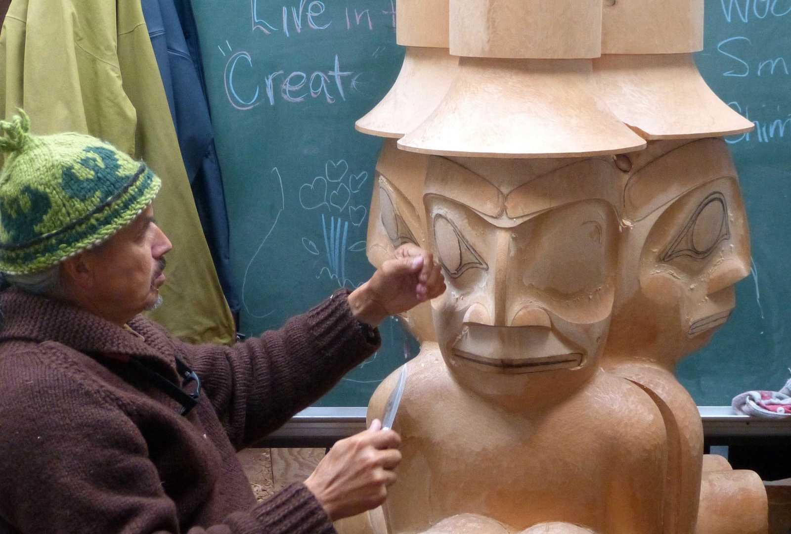 We boarded the Haida Gwaii version of luxury transportation and headed north over the only paved road to reach the community of Old Massett.  It is the center of a resurgence of Haida culture that began in 1969 when the first totem pole to be erected in over 100 years was raised here.  Now, a number of widely recognized carvers, artists, and canoe-builders live and work here in Old Massett, passing on their traditions to the next generation.  One of the carvers is Jim Hart, known by his Haida chief name of Uidansuu.  He holds a hereditary chiefdom, which, by Haida tradition in this matrilineal society, was inherited from his maternal uncle.  We found him, with his son, working on a large pole, carved in the round from a Western redcedar log.  Haida art is evolving, and this pole is an example.  It is carved in traditional form line design, but the theme is one of reconciliation, as the Haida struggle to recover from the dark days when their children were taken from their home communities by the government and sent away to boarding schools in an attempt to exterminate their language and culture.  (The Canadian government has formally apologized to their First Nations people for the abuses of this era.)  The pole includes an image of the government school, not exactly a traditional design feature.  All the while, as he described the pole and the carving process, Uidansuu and his son continued their work.  When it is completed next month, this massive pole will be erected in Vancouver, a process that will take some 800 people pulling on ropes, and culminate in a grand celebration of Haida culture, all under the supervision of the chief.