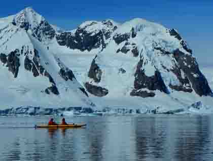 In the afternoon National Geographic Explorer was moved a short distance to Cuverville Island, which is home to the largest colony of gentoo penguins in Antarctica. There was a chance to walk to the top of the island for more spectacular views of the waterways and other islands that lie along the coast. Others took their first opportunity to kayak. Kayaking in Antarctica is a great chance to move silently through the water and amongst the ice. There was just enough ice to make it interesting and not so much that the kayakers could not be seen by the weary eyes on the bridge and safety boats. Towards the end of the kayaking operation a surprise visitor showed up. A small group of killer whales approached the ship, but then quickly turned around and swam towards a few Zodiacs that were ferrying guests from shore. Close looks were had by some, but then the killer whales vanished as quickly as they appeared.