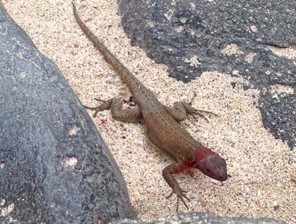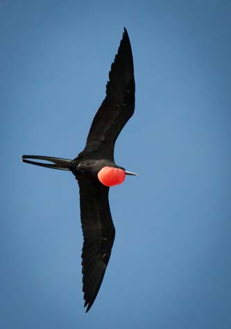 The upwelling not only maintains marine life but also seabirds, so this morning we went on zodiac cruises around the small island to look at the seabird colonies. Not only did we see a large number of brown pelicans, brown boobies, blue-footed boobies, and magnificent frigatebirds, we also got some good looks at male frigatebirds with their red gular pouches inflated for courtship, and some brown booby chicks.