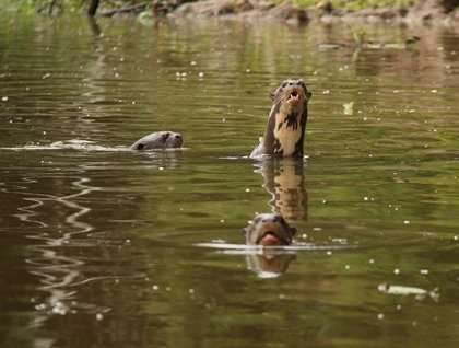 The otter family had at least three adults and three babies. The kids were stuffed into a riverside burrow while the adults snorted and observed the boatload of people floating in the stream. The capybara grazed alongside the river in a lovely picturesque setting, green grass, yellow flowers, and forest backdrop. We played hide-and-seek with the fer de lance in a patch of water hyacinth, always staying a safe distance with us in the skiff and the snake in the waterweeds.