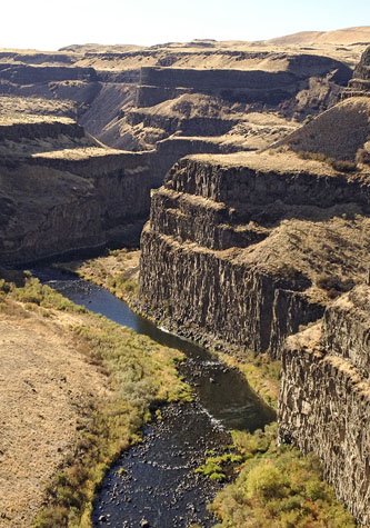 A waning gibbous moon rides high in the western sky as earliest dawn breaks breezy and clear. Dark basalt cliffs loom on either side of the Snake River as the sturdy National Geographic Sea Bird nears the lock at Little Goose Dam. After a short wait we are given the green light and Captain Kay eases our ship into the lock. Our able deckhands toss a line over the floating bollard and make it fast. This line will keep the ship snug against the lock wall for our transit. The water drains from the lock by gravity and soon we have dropped a hundred feet to the level of the river below the dam. The great barn-door gate swings slowly open and away we sail, bound for the mouth of the Palouse River. On the way to our anchorage on the Palouse we are astonished to see a Mule Deer doe swimming across our bow, her head and large ears held high. Captain Kay slows the ship and the determined doe swims steadily to the far side of the river. Meanwhile, the rising sun burns golden on the buff-colored grasses of autumn and dark basalt cliffs cast angular shadows on the hills.