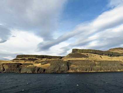 We have a following wind so it is very pleasant on the bow and many of us stay out to watch for wildlife and enjoy the beauty of the wind on the water, beautiful clouds, and the brown basalt cliffs trimmed out with the buff colored grasses of autumn. We see flocks of Canada geese, a codgery of coots, a rough-legged hawk, two mule deer does with their fawns, and more. Soon after locking through Lower Monumental Dam we come to some special outcrops of basalt. The first is a great block of dark basalt rock named “Ship Rock” by Lewis and Clark and now called Monumental Rock. Just past Ship Rock on the other side of the river we are astonished by the intricate design made on a hillside by the weathering of the entablature, the blocky-fractured upper layer, of a lava flow. Many suggestions, from an ice-cream sundae to a jellyfish, are made about what this unusual and intriguing outcrop resembles. Our historian, Junius, gives a presentation on the Lewis and Clark expedition.