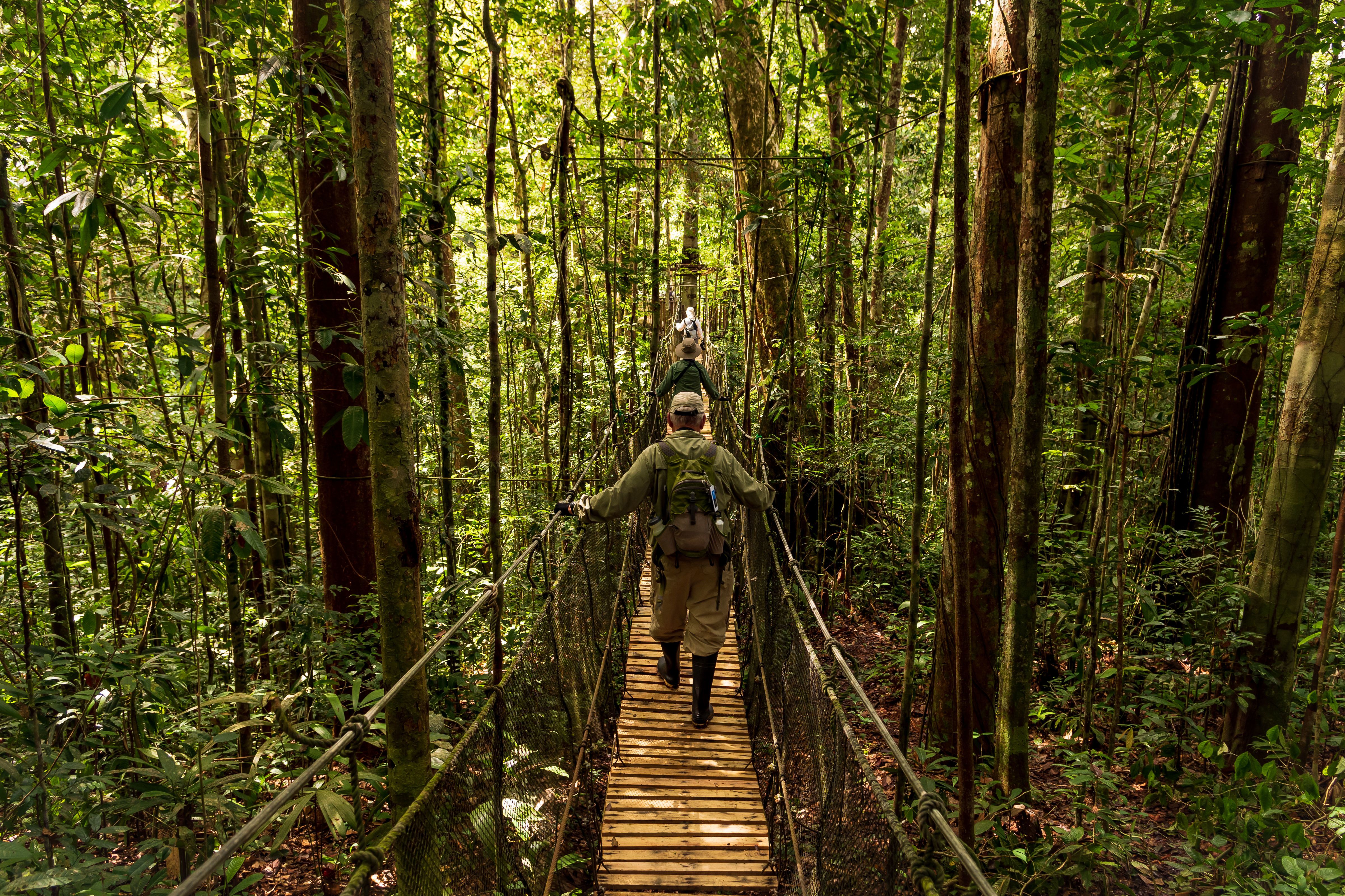We departed in the early hours for our exploration of Yanayacu River, a tributary of the Marañón River. As soon as we boarded the skiffs, we spotted pink river dolphins foraging in the shallow waters with neotropic cormorants. At this time of year, the landscape is dotted with different species of birds, including large flocks of great egrets. We entered the kingdom of the endless forest, through which most of the rivers flow to form larger ones. The Ucayali and the Marañón Rivers eventually merge, giving origin to the mighty Amazon. This jungle is vibrant and full of life, from birds to monkeys. This morning was a special one, as hundreds of egrets mixed with cormorants, wood storks, and kingfishers. All of them foraged in the early hours. In the afternoon, we visited Amazon Park to explore the forest and suspension bridges. This forest is a pristine one, as no tree has ever been cut. The ecosystem is just like it was thousands of years ago. This is the kingdom of the giants! All the trees in this forest are around a hundred feet tall. We were happy to visit such a pristine spot in the Amazon. Indeed, we felt small as we walked under the canopy. There is so much foliage that there is not much light near the ground of the forest. The rainforest is just amazing!