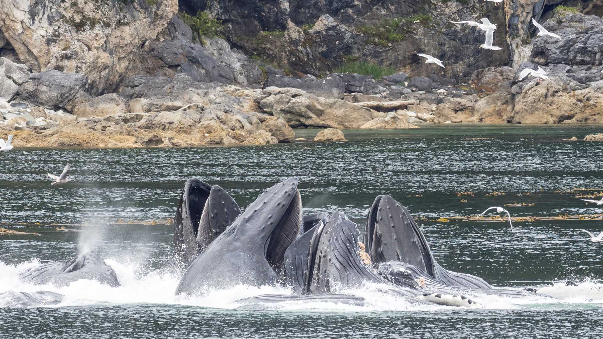 After lunch we left our anchorage at Pavlof and headed out to look for more wildlife, particularly humpback whales. Amazingly enough, the weather got even better. Some sun and little wind, perfect conditions to spot our quarry. It was only a matter of minutes until a group of whales were spotted feeding in a very specialized fashion called bubble-netting. Multiple animals worked together to surround herring in a net of bubbles released by one whale, while the others scare the fish into a tighter ball with loud calls or by flashing the light side of their pectoral fins at the potential prey. What an amazingly orchestrated way to hunt.