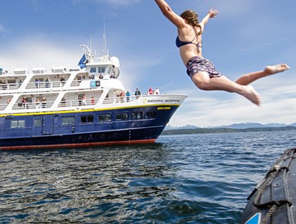 Pavlof Harbor is an important salmon stream that is surrounded by old growth forest and a high concentration of bears. Within weeks, the pink salmon will be running in force. The Southeast Alaska sun warmed our bodies and we strolled through the forest and kayaked the bay. This created the perfect opportunity for a “polar plunge” when we returned to the ship and over two dozen of the guest participated in a quick dive into the low 50 degree waters for a true Alaskan experience.