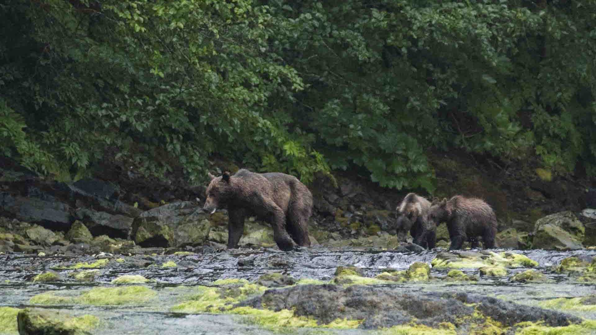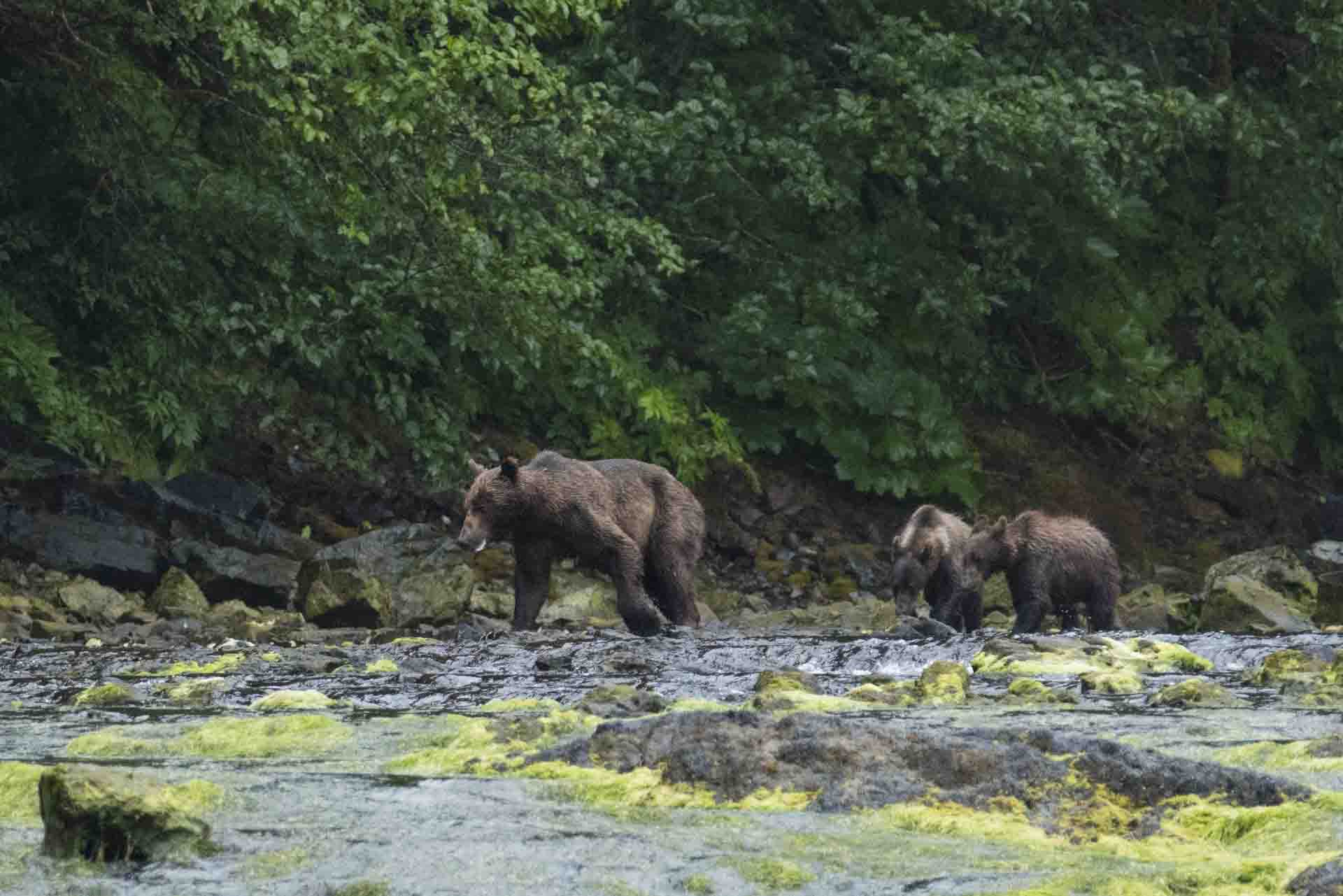 We awoke this morning to find typical southeast Alaska weather: clouds, wind, and steady rain. The National Geographic Sea Lion cruised into Pavlov Harbor on the south side of Chichagof Island and dropped anchor. We geared up in layers and boarded expedition landing crafts to check out the shoreline in search of brown bears. Near the waterfall, we sighted a female brown bear with her two cubs that were in search of migrating salmon.