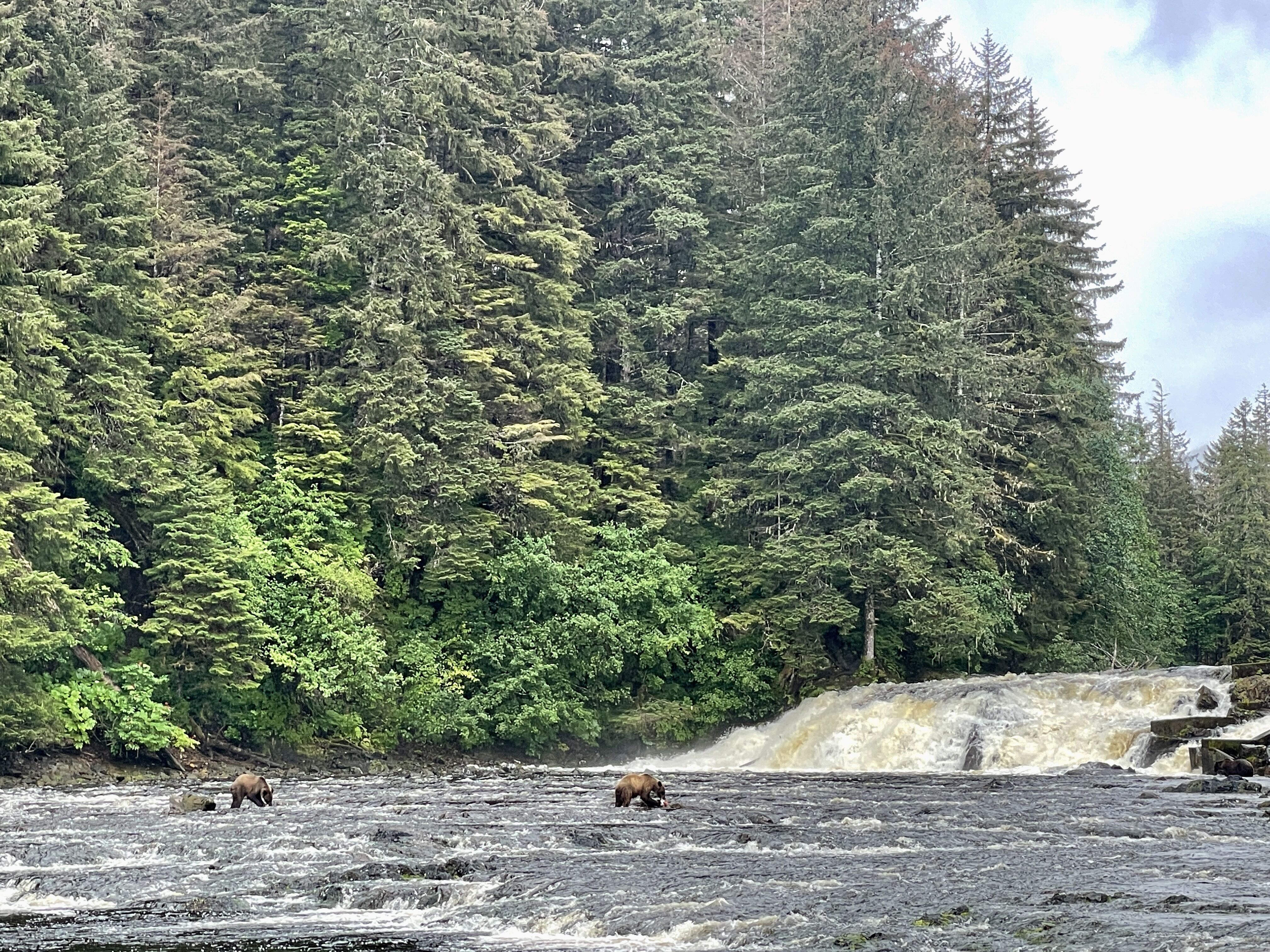 It is day six of our trip, the final full morning of operations before we sail to Sitka. We have missed seeing good views of brown bears. Our expedition leader has a plan that ends up giving us views of bears beyond what we hoped for. Breakfast is early before we hustle to shuttle guests to shore. A ten-minute hike around the point and up the small salmon river is the setting for a fabulous show. There are five brown bears! We observe a pair of subadults and a sow with cubs. At one point, the more aggressive of the cubs starts an unearthly growling noise and tries to nurse on his mum. She is hungry and focused on fishing, and she gives a much louder and more aggressive growl in response, as if to say, “Dinner is ready when I say it is!” The youngster gets the message, and the family moves on. This opportunity to watch such wildlife in silence is a gem within the trip. We witness two successful catches of silver salmon and must refrain from cheering for the bear’s reward. There is much to contemplate as we sail through stormy weather back to port.