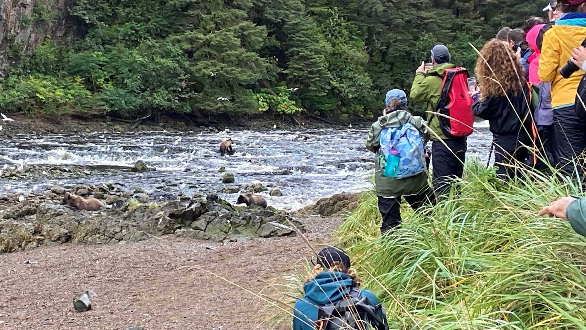 Our first group returned to the ship, and we kept our fingers crossed that the bears would remain. We were not disappointed!  In fact, the second viewing was possibly even more exciting. A total of eight bears were seen, and while we watched the waterfall action, the mother and her two cubs emerged behind us on the trail we intended to use!  Our plans quickly changed; we loaded our Zodiacs and made our retreat, allowing the bears full access to the beach and their salmon breakfast.