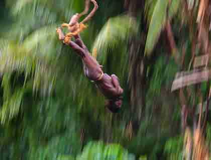 There are fifteen divers today, each will dive in turn, each higher than the next. The youngest, and first to take the plunge, is only six years old a still significant twenty feet above the ground. The divers climb up to thin platforms (of an appropriate height for their age and experience) that will barely support their weight as to snap and help to break their fall once they take the ultimate in leaps of faith. Lashed to their ankles are vines that have been expertly measured and tied by veterans of this extreme ritual that is only practiced here on this one island of Vanuatu. The song becomes a chant, the diver ceremonially raises his hands high above him and begins to almost imperceptibly rock back and forth. Time itself seems to pause and become another member of the audience, utterly captivated by the anticipation of the moment. Then, as if it was the most natural thing to do in the world, he leans forward and drops, falling towards the earth below, and into our memories forever. I still can’t believe it though.