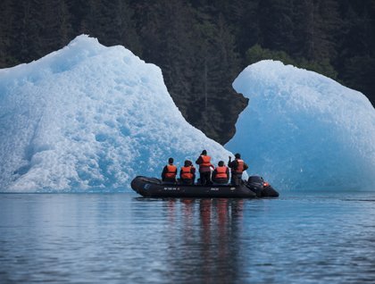 Following a late evening of watching humpback whales in Stephens Passage, the morning sun greeted us with clear skies, calm winds and a very comfortable 60*F. After a delicious breakfast, we loaded into expedition landing craft to see large icebergs which had floated down from their calving some 10 miles up the ice choked LeConte glacier fjord.   As we crossed the terminal moraine, a slight color change in the ocean water indicated the presence of glacial flour. Our journey brought us close to icebergs the size of small houses beached on the shores, left there from the ebbing tide. Discussions ensued as to the rate of glacier retreat potentially related to climate change with National Geographic Sea Lion’s naturalists sharing that one needs to also take a series of long-term measurements of the ice field depth to better evaluate potential impacts of climate change on ice field mass. Further conversation shifted to the contrast to the white tops of the icebergs exposed to the atmosphere and the bluish tinge of the normally submarine section (now suspended on a moraine shelf by the low tide) caused by the increased density of the ice when placed under great pressure inside a glacier.  It is this ice that was historically used to prevent fish from spoiling while being transported to Seattle, Portland and other west coast markets in the early 1900s.