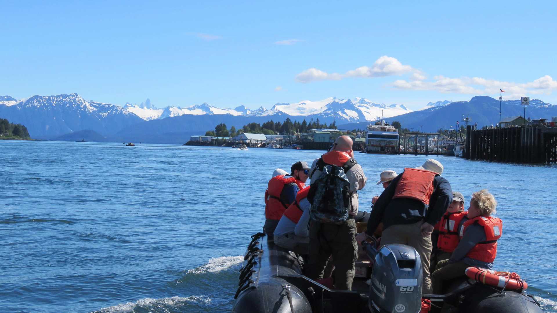 The afternoon brought us to the outwash plain of Baird’s Glacier for some Zodiac and hiking explorations. We landed on the beach of one of the islands formed by the glacier for a short hike along the muddy and rocky shores. The glacier could be seen in the distance, with small pieces of ice in the foreground. The weather graced us with a few drops of rain to wrap up a great day in Southeast Alaska.
