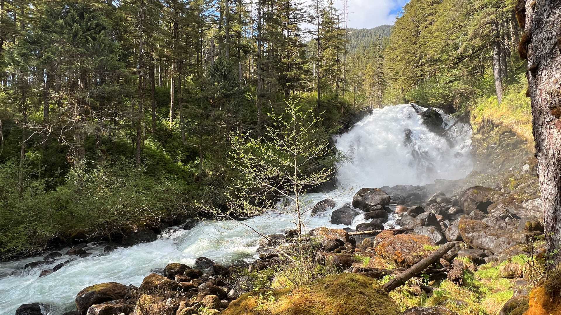 The afternoon brought us to the nearby anchorage of Thomas Bay, where we went for a glorious hike at Cascade Creek. This densely forested trail meanders up the river to the lowest set of falls. A large cascading waterfall misted the group. Stone steps serpentined up the hillside, leading to a switchback forest trail. Eventually, we made it to a bridge where folks crossed the raging river with a view of the falls.