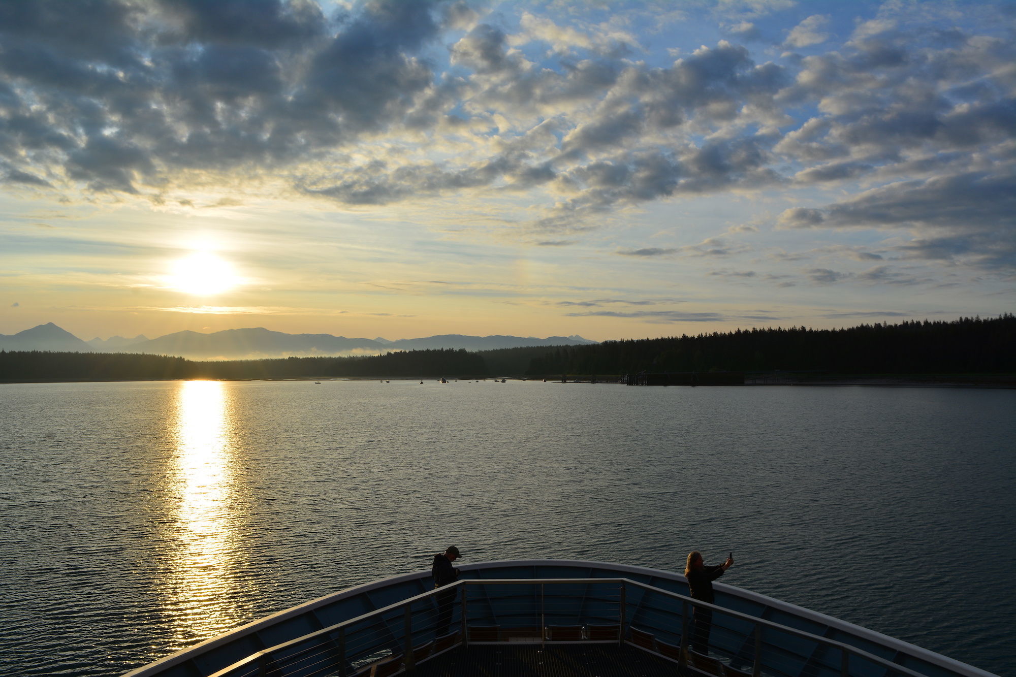 During the morning, we explored the scenic cove of Pavlof’s Harbor on the southeast shore of Freshwater Bay, Chichagof Island, and area known for its healthy salmon stream. We were optimistic that we might still see a bear during our last day exploring Southeast Alaska. We were not disappointed! At the base of a small waterfall, we spotted a coastal brown bear casually gorging itself on salmon as we watched, spellbound, from the safety of our expedition landing crafts only a few yards away. The bear, enjoying its meal, seemed oblivious or at least indifferent to our presence. For nearly an hour, we watched the animal devour fish after fish until it calmly walked up the river bank rocks and into the forest. Late summer and early fall is the time to fatten up and prepare for the long winter ahead. Come November and the onset of snow, brown bears will leave the coastline and head to higher elevations near or above treeline. Biologists debate whether bears truly hibernate or just den up and sleep during the winter. Pregnant sows will give birth to tiny, one-pound cubs while sleeping within the den and nurse them until spring. We returned to the ship after our morning adventures for lunch and were relaxing in the lounge when another bear was spotted on the beach south of Pavlof Harbor. Although more distant than our first encounter, we all enjoyed another exceptional sighting of a coastal brown bear. But the wildlife viewing wasn’t over yet! As we sailed south along Chatham Strait, we encountered a pod of killer whales swimming nearby. Crusing alongside the pod, we counted a group of about ten that included one large male. His large dorsal fin rose nearly six feet above the water‘s surface. Guests spent the remaining time reading or chatting with friends. We wrapped up our day with the captain‘s dinner followed by the guest photo slideshow, which we enjoyed as we sailed toward Sitka through Peril Strait. Have we seen it all? Hardly! But we left with a sense of fulfillment, knowing that we saw a lot! And maybe one day we‘ll return and finally see some elusive moose!