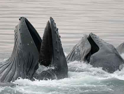 Perhaps the whales were listening to Flip’s talk “Among Giants” as not long after he finished sharing some wonderful stories about his life with whales, we found ourselves in the midst of a story of our own. A few blows were spotted as we neared Snow Pass, and everyone headed out to the bow with hopeful anticipation…and cameras. Suddenly we were in the midst of a group of humpback whales cooperatively feeding! This remarkable behavior is incredibly exciting to watch and to photograph. We were fortunate to have calm seas and we could often see the ring of bubbles form as it rose to the ocean’s surface and delineated a perfect circle. Open mouths of forty-ton animals burst through the middle of the net and gulped the fleeing small fishes while gulls wheeled and called and fed on the uneaten bits. We watched the astonishing behavior and listened to the trumpeting feeding calls until the light was gone and our own dinner was served. This was not a great day to be a herring in Snow Pass, but wow, what an afternoon to be on the bow of the National Geographic Sea Bird!