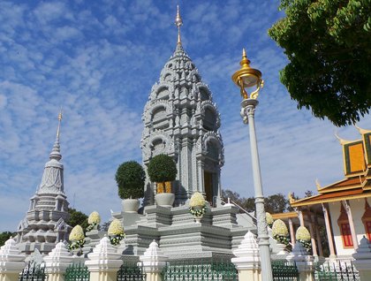 At breakfast time, the Jahan has lifted anchor and moves downriver to dock near Wat Phnom, the hill from which the city takes its name. Stating that today is a day of contrasts would be an understatement. It will be a full day with many moving experiences from the beauty of the Royal Palace and exquisite ancient Khmer to experiencing the darkness of the Killing Fields. At the dock, cyclos are waiting to take us on an exhilarating tour of Phnom Penh. From the striking colonial building of the Post Office, around the hill of Wat Phnom, past the U.S. Embassy compound and around the Central Market, our cyclo drivers are weaving in and out of the morning traffic towards the road along the river, which brings us to our final destination: the large open square in front of the Royal Palace.