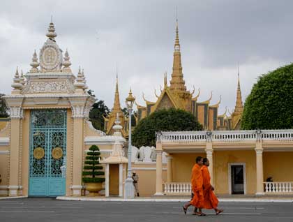 We docked along the banks of the Tonle Sap and disembarked Jahan for an exciting adventure. We rode in the front of local cyclos, which are basically carts, pedaled by very strong and wiry Cambodian men. The traffic was quite overwhelming and we were taken all over the main parts of the city. We rode past the Central Market, the beautiful Post Office, the U.S. Embassy, and countless bars, motorbike repair shops, and belt manufacturers. Much of downtown Phnom Penh does not have traffic signals, so everyone snakes through intersections, taking up whatever space is available at the time. Our ride ended at the square in front of the Royal Palace and our guides began a walking tour of the complex.
