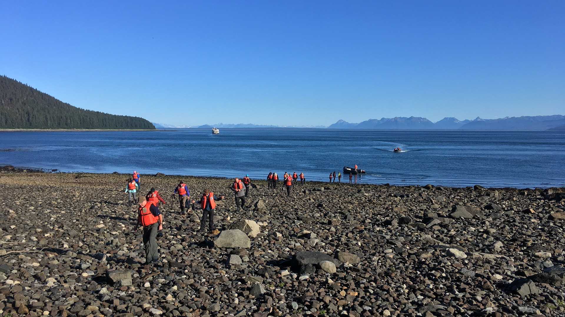 This morning we woke up to spectacularly rare weather for Southeast Alaska: sunny, very clear skies, and almost no wind. The bridge officers of National Geographic Sea Bird navigated into Pinta Cove, at the northern end of Chichagof Island, where we set anchor. Before breakfast, the whole expedition staff set off to scout the landing. Around this same time, guests and crew noticed the blows of whales, some rather close to the ship.