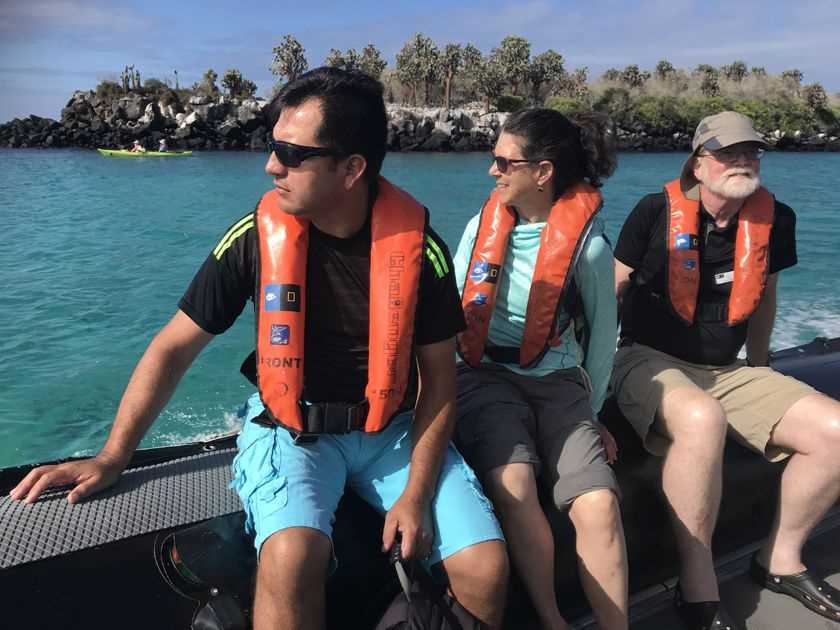 From the distance, we could see our landing on a white sandy beach and as we approach it, we were been greeted by sea lions and then we had two different walks one short and another one long along an impressive cliff for a breathtaking landscape. Back to the beach for a refreshing rest at the beach with sea lions and with white tipped reef sharks, white spotted eagle rays, turtles, pelican and even a blue-footed booby. Today we were searching for a species of land iguana that can only be seen here. Some of us opted for kayaks as we were surrounded by an impressive landscape.