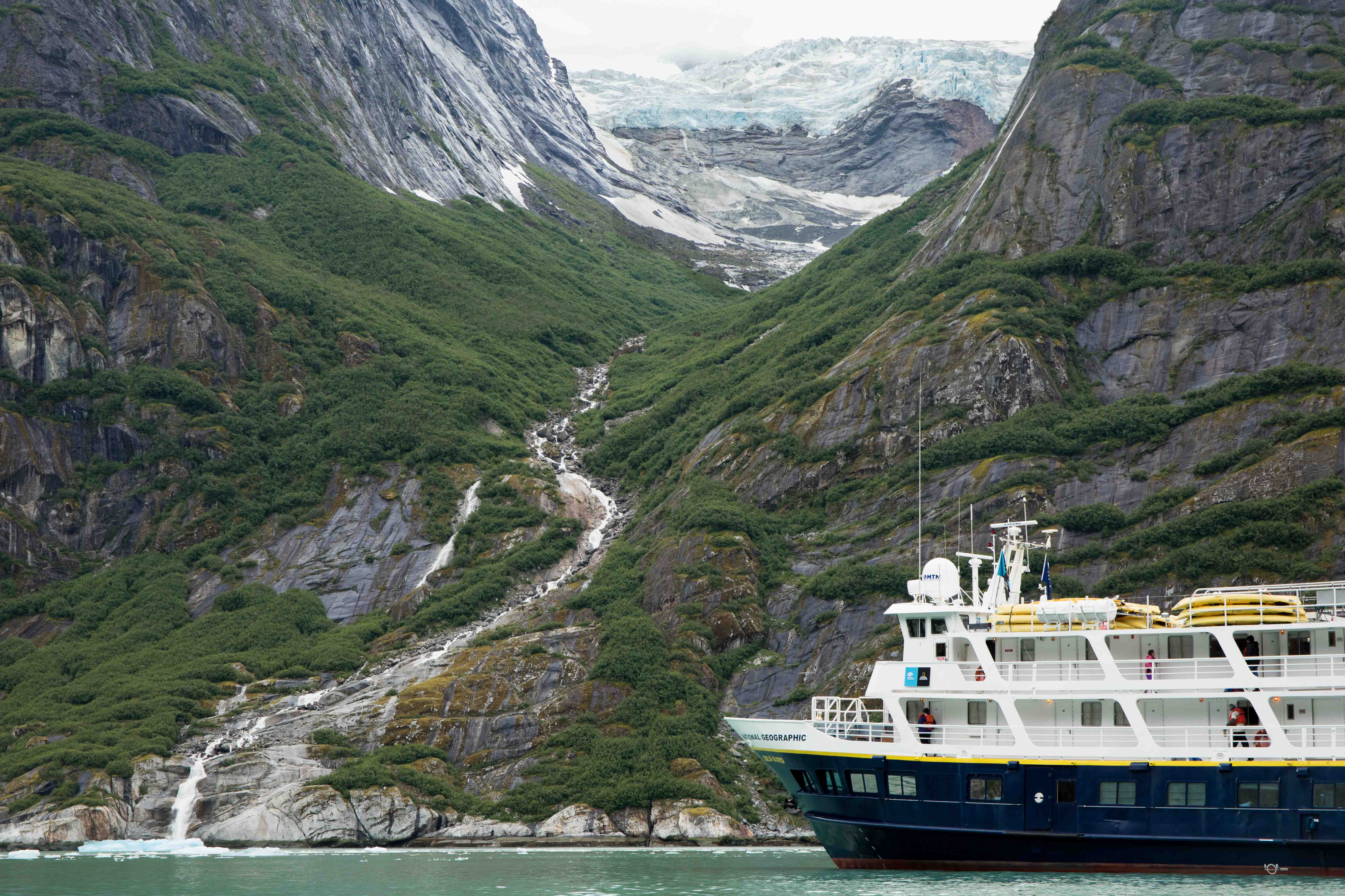 As we departed from Kelp Bay and made our way south, into Chatham Straight with naturalists on the bow as lookouts. It wasn't long before they spotted a group of humpback whales bubble net foraging. Observing this behavior is a treat- as it was only relatively recent that it was first observed, in the 1980's. We watched this behavior for about a half an hour, until the cold wind forced us inside for some warm beverages. We sailed towards the picturesque Kasnyku Falls, which we were able to get incredibly close to with our vessel.